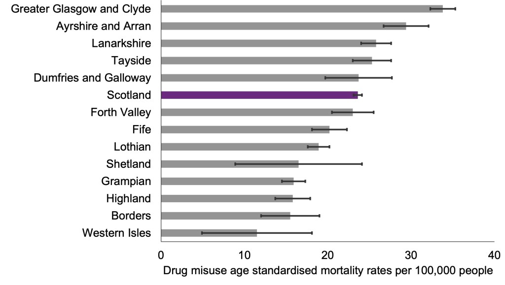 Opioids and opiates – such as heroin – remain the deadliest drug in Scotland, a factor in eight out of every ten drug deaths, overwhelmingly affecting the 35-54 age bracket is overwhelmingly affected.